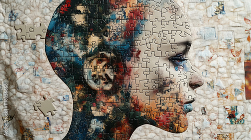 Sylwetka głowy z puzzlami jako elementami układanki, które ilustrują złożoność zdrowia psychicznego oraz różnych zaburzeń osobowości.