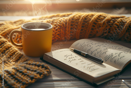 otwarty notes z piórem, parującą filiżankę w żółtym kubku i ciepły, dzianinowy koc w promieniach miękkiego światła.
