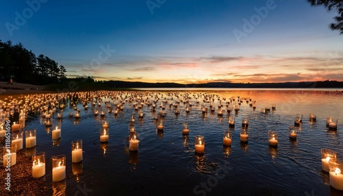 a serene scene unfolds as dozens of candles flicker gently in clear glass holders illuminating the area during an evening vigil the sun sets casting a warm glow over the lake enhancing the tranqui