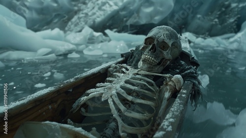 Skeleton in boat in frozen Arctic landscape, wearing jacket, surrounded by ice. Desolate scene with large ice formations and water.