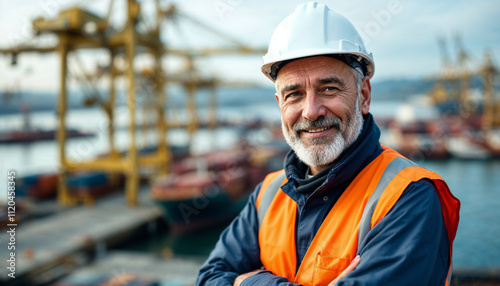 A confident seaport worker in a high-visibility vest and hard hat, with a bustling harbor backdrop.