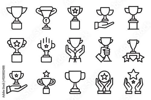 Hand with tropy various style editable stroke outline icon set isolated flat vector illustration white background
