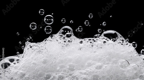 Frothy dish soap foam rising in a plastic basin, the intricate bubble structures highlighted on a solid black field