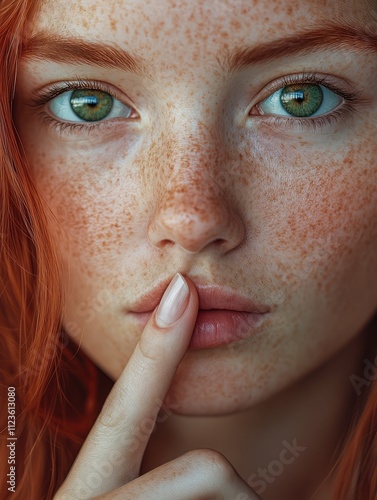 Top secret. Close up view of cute ginger young female with freckles and green eyes, holding a finger on her lips, saying 'shh', asking to keep silent about her big secret, looking at the camera