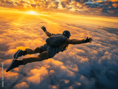 Skoczek spadochronowy swobodnie spadający przez chmury na tle rozświetlonego horyzontu.
