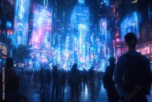Futuristic City Night Scene with Crowd