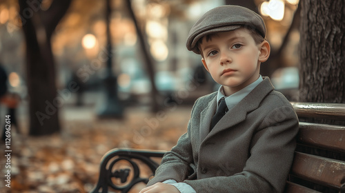 Zadumany chłopiec w garniturze i czapce spogląda w dal, siedząc na ławce w parku, na tle rozmytego zgiełku miejskiego.