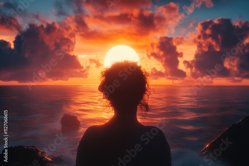 Woman Silhouetted Against Vibrant Sunset Ocean