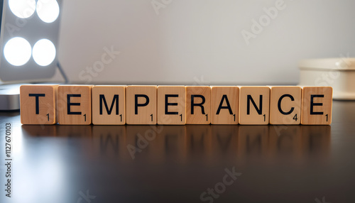 Temperance word from wooden blocks on desk isolated with white highlights, png