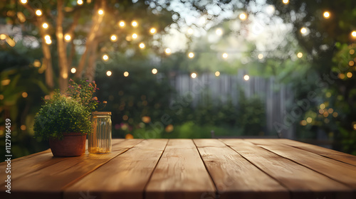 Vintage wooden table with blurred garden background, backyard, vintage, bokeh lights, al fresco dining. Fresco. Illustration