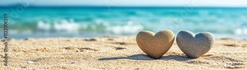 Valentine romantic getaway. Valentine sweetheart moment. Two heart-shaped stones on a sandy beach.