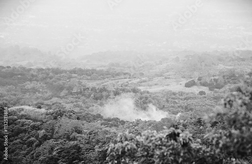 Czarno-białe zdjęcie przedstawiające pożar tropikalnego lasu. Dym palącego się lasu w junglii. Niebezpieczeństwo związane z pożarem i brakiem ostrożności w lesie.
