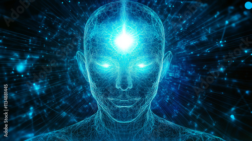 Enlightened digital being with radiant third eye glowing in blue energy amidst a network of interconnected light and cosmic patterns