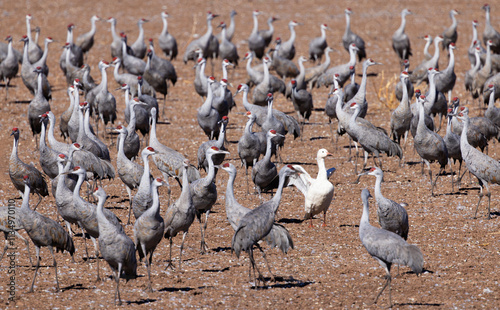 Humorous single Snow Goose flaps wings in midst of Sandhill Crane flock highlighting oddity and difference concepts