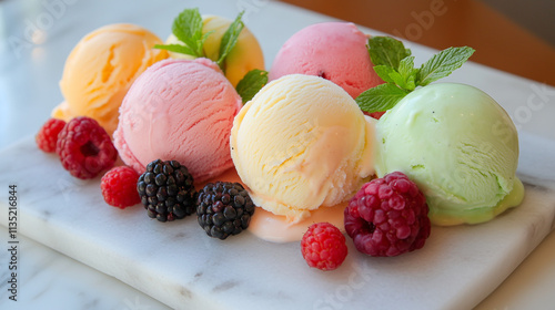 Kolorowe kulki lodów starannie ułożone na marmurowym talerzu z dodatkiem świeżych owoców dla podkreślenia smaku.