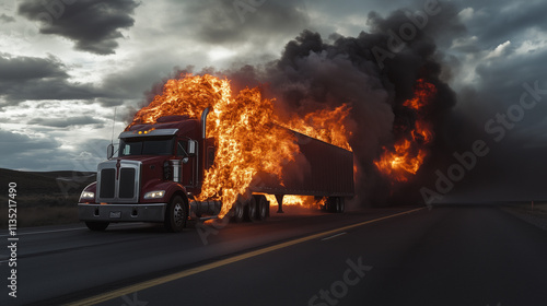 Płonąca ciężarówka na autostradzie, otoczona dymem i ogniem, kontrastuje z pochmurnym niebem, podkreślając intensywność i zamieszanie sytuacji.