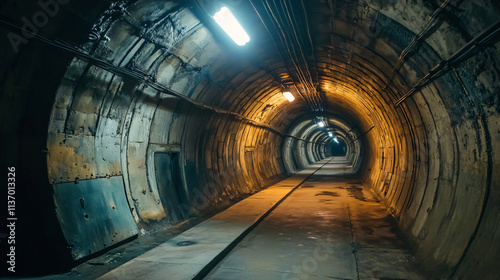 A massive underground bunker with concrete walls, dim lights, and long corridors leading into darkness.