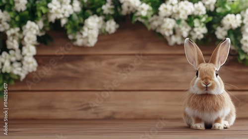 Królik wielkanocny siedzący na drewnianej powierzchni z kwiatami w tle