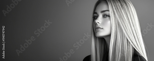 Young woman with long straight hair poses elegantly against a gray background in a stylish fashion shoot