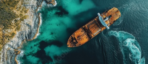 Aerial perspective of tanker with oil spill - Environmental disaster seen from above in high angle shot