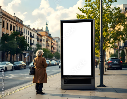 Mockup de cartel publicitario en la calle de una ciudad y una señora observando. Día soleado