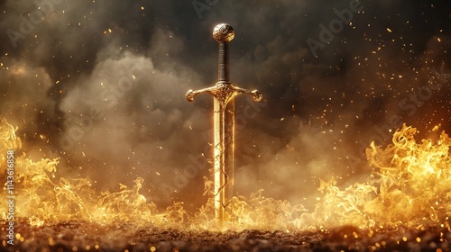 A cracked and damaged sword being reforged in a fiery forge engulfed in golden flames symbolizing the of justice and the triumph over corruption