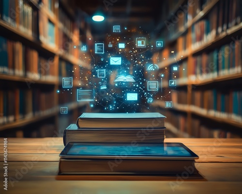 Wooden table with a tablet showing educational icons and floating books
