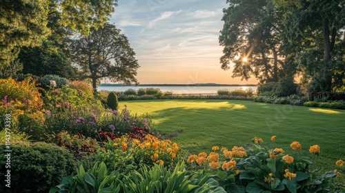 A tranquil evening in lush gardens overlooking the serene lake at sunset with vibrant flowers and greenery enhancing the landscape