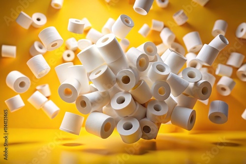 Action Shot: White Toilet Paper Rolls Exploding on Yellow Background - High-Resolution Product Photography