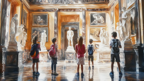 Young learners admiring classical sculptures in museum, surrounded by art and history, fostering curiosity and appreciation for culture in bright, elegant gallery setting