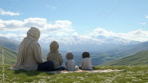 Meadow Family. Family sitting on green meadow with mountains backgroun