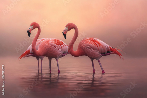 Flamingos standen elegant im Wasser bei mystischem Sonnenuntergang