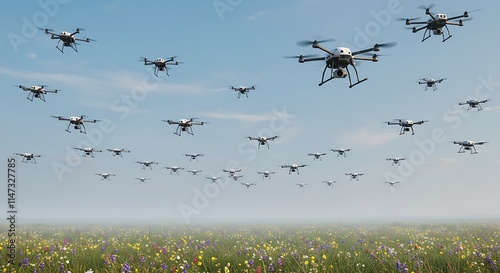 A swarm of drones flying in formation against a sunset sky, capturing the modern technology of unmanned aerial vehicles in a beautiful and serene setting