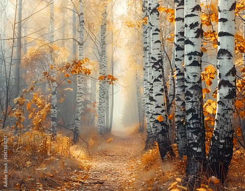 Jesienny brzozowy las z wąską, malowniczą ścieżką, otoczony złotymi liśćmi i mglistą atmosferą poranka.