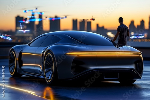 A sleek self-driving electric car navigating a futuristic cityscape, surrounded by holographic traffic signals and AI-controlled drones