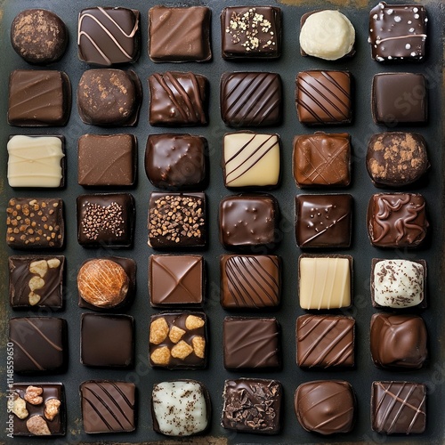 Surtido gourmet de bombones artesanales con diseños y sabores únicos, incluyendo chocolates oscuros, de leche y blancos, dispuestos en una elegante presentación