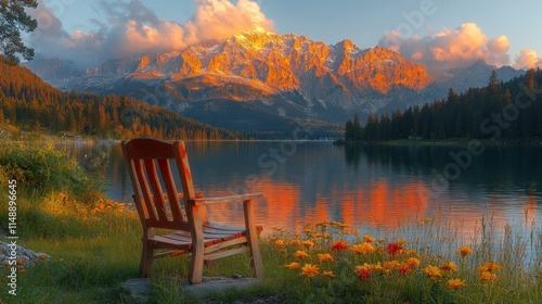 Wooden chair by a lake with mountain sunrise view.