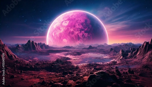Generated image : paysage fantastique avec à l’horizon, une planète rose