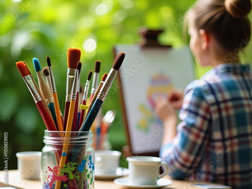 Młoda dziewczyna skupia się na malowaniu w plenerze, na pierwszym planie stoi słoik z pędzlami i kolorowy kubek, a wokół niej rozciąga się zieleń.