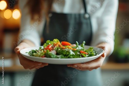 A waitress with an apron sets down a plate of salad for a guest in a minimalistic restaurant