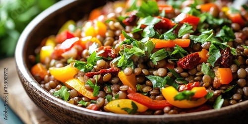 A vibrant bowl of homemade Mediterranean lentil salad featuring lentils, colorful peppers, sun dried tomatoes, and fresh parsley, perfect for a healthy and flavorful meal with lentils.