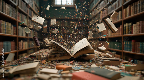 DISCOMBOBULATE, A whimsical image of a library scene with books dramatically falling off shelves, capturing a moment of chaos and creativity in literature.