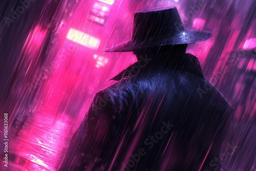 A mysterious figure in a dark hat stands in the rain, illuminated by vibrant pink and purple lights, creating a dramatic and moody atmosphere.