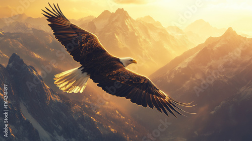 Wspaniały orzeł bielik w locie nad malowniczymi górami, uchwycony w momencie, gdy jego pióra lśnią w pierwszych promieniach wschodzącego słońca.