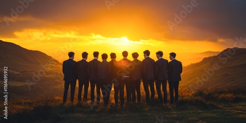 A group of individuals stands together against a stunning sunset backdrop. The silhouettes create a sense of unity and friendship in nature. Ideal for teamwork or inspiration themes. AI
