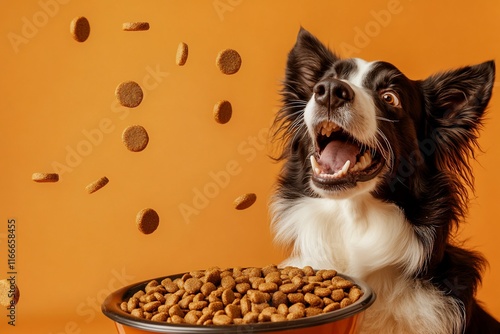 Happy Border Collie dog with mouth open catching flying kibble from a bowl against orange background.