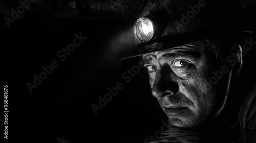 Górnik, wynurzający się z ciemności kopalni, nosi na twarzy ślady pracy, rozjaśnione subtelnym blaskiem lampy na hełmie, w ponadczasowym ujęciu.