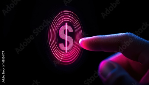 A fingertip touching a glowing digital dollar sign, symbolizing finance and modern transactions.