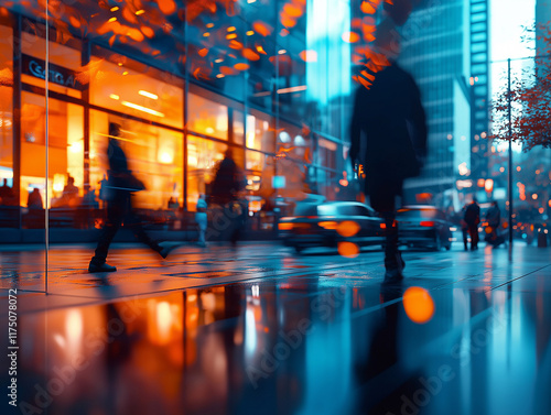 Reflexionen von Menschen und Taxis in einer urbanen, modernen Umgebung