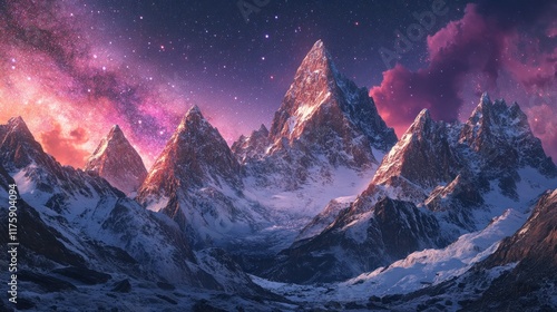 Majestic snow-capped mountains under a vibrant, starry night sky.